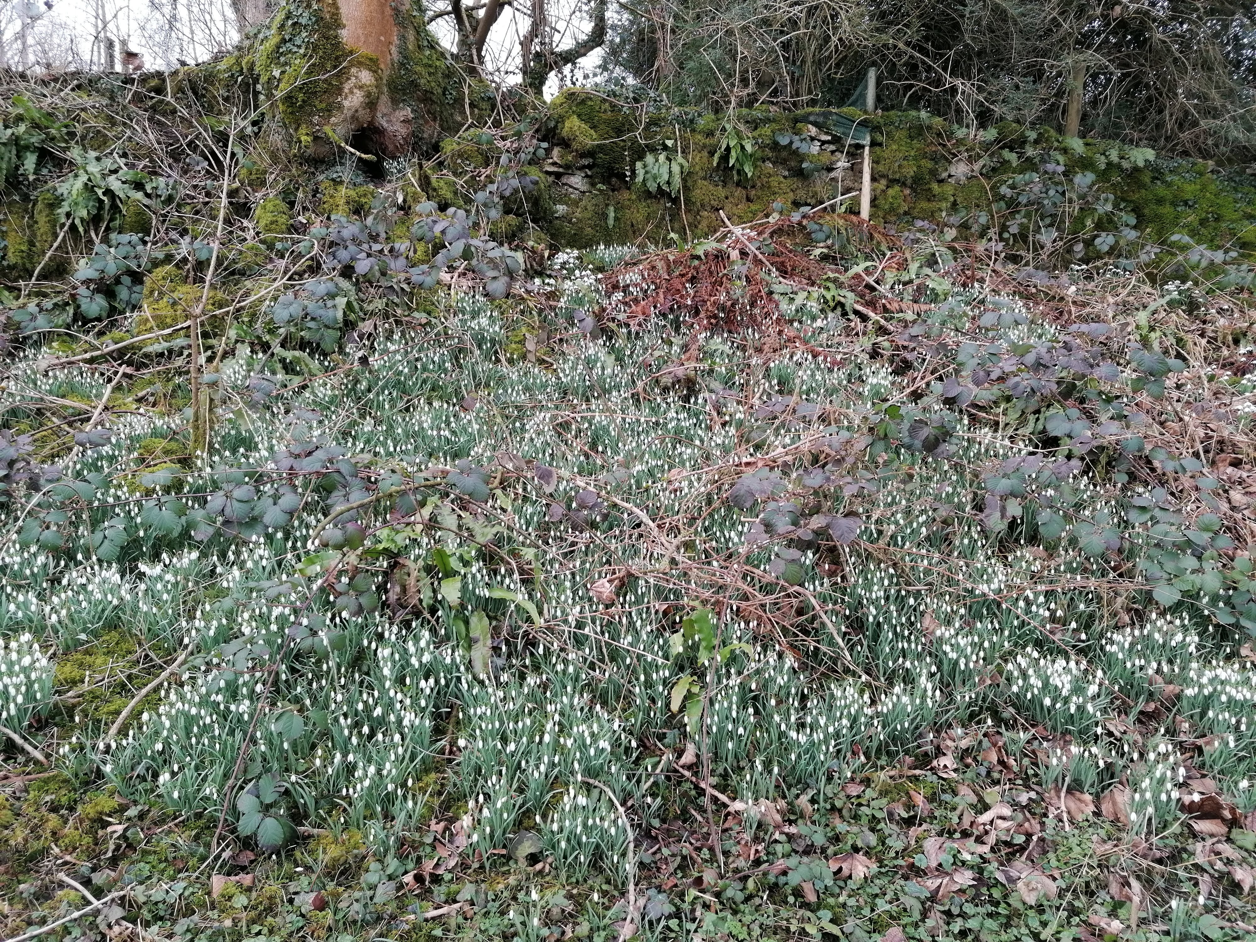 Snowdrops have this helmet-like flower to them and cluster in groups, looking like a very tiny army. My mother submitted the best one, though: A drift.