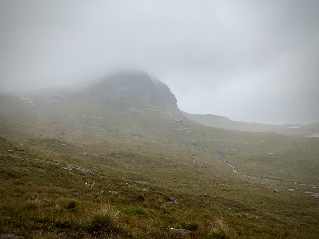 I donned my jacket and waterproofs and continued on, smiling like a fool as the rain washed over me and I watched several deer disappear into the veil that had consumed the rest of the world. The path struck directly uphill, following a burn.