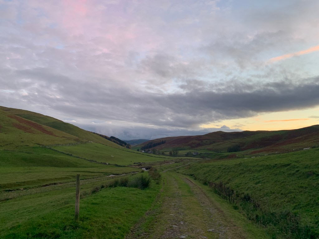 As I followed the River Esk, I passed through the town of Bentpath before crossing a bridge to head up the glen to Jamestown and Glendinning. The sun had now lowered behind a forested hill behind me, and I made my way up a single-track road with sheep as my main company.