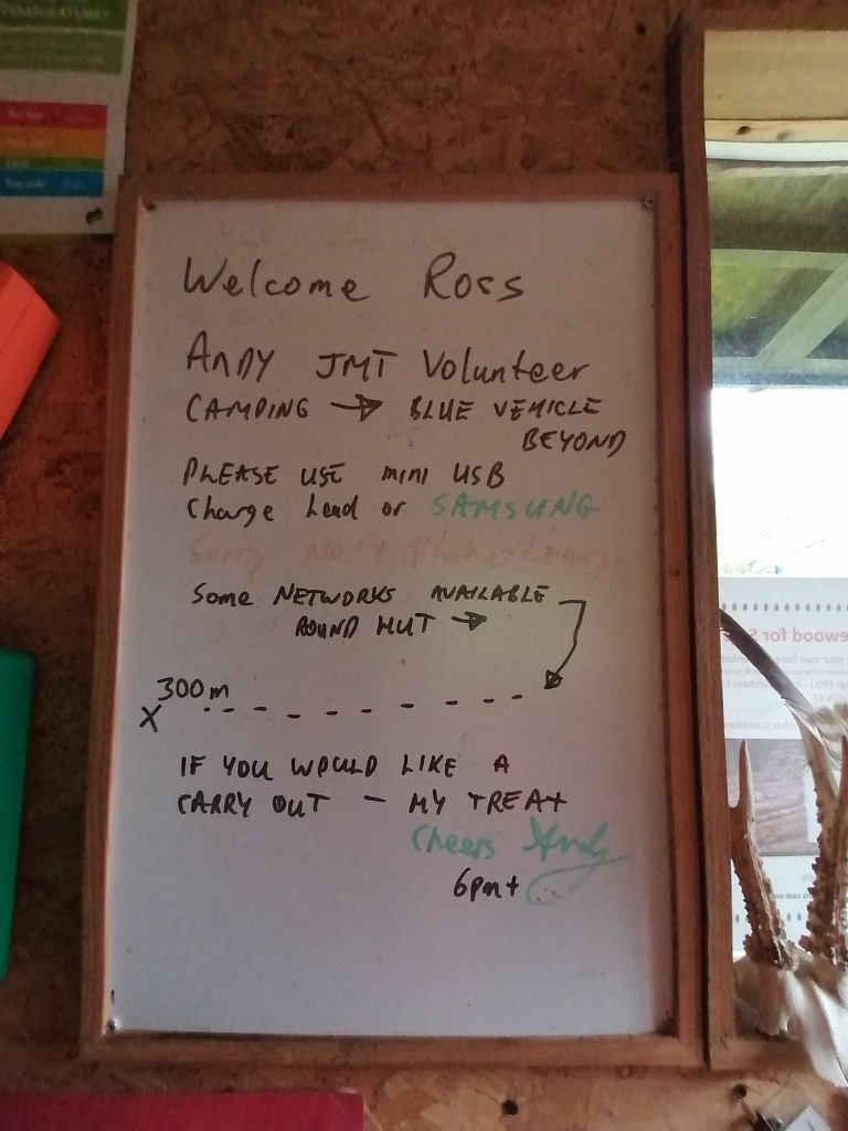 “Please use mini USB charge lead or Samsung. Sorry no iPhone lead. Some networks available round hut.” Here he drew a diagram.