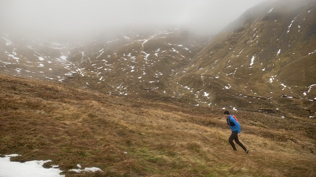 According to Tom’s 1:40,000 map, the Aisre Ghobhainn looked like an extremely narrow ridgeline. Agreeing we’d head over to suss it out and having made a get-out option, we trotted along the soft, easy top to this thin shoulder.