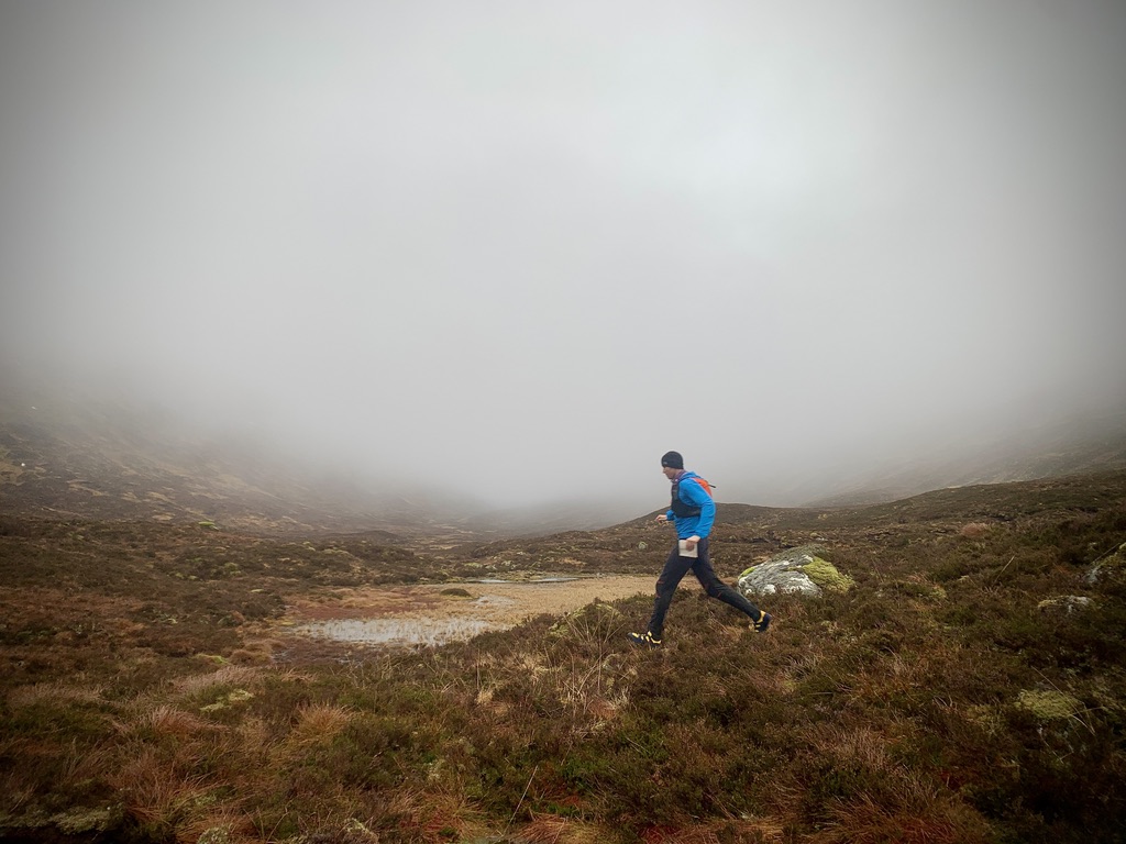 We had now left the clag behind, running along easy ground to Carn Dearg. Once or twice, a white ptarmigan would erupt from behind the rocks, while a heard of nearly 40 red deer bounded across the heather ahead of us. Once over Carn Dearg’s rocky red peak, we had to shoot off right to Culra Bothy.