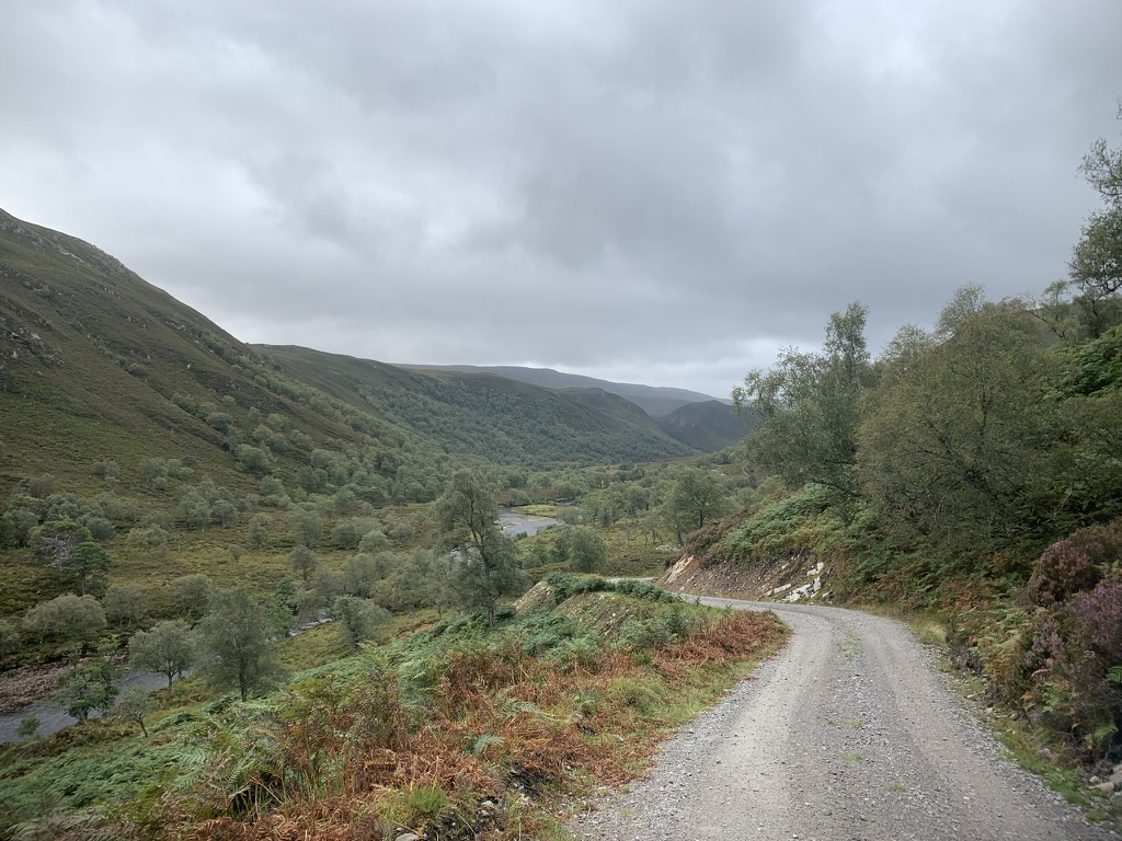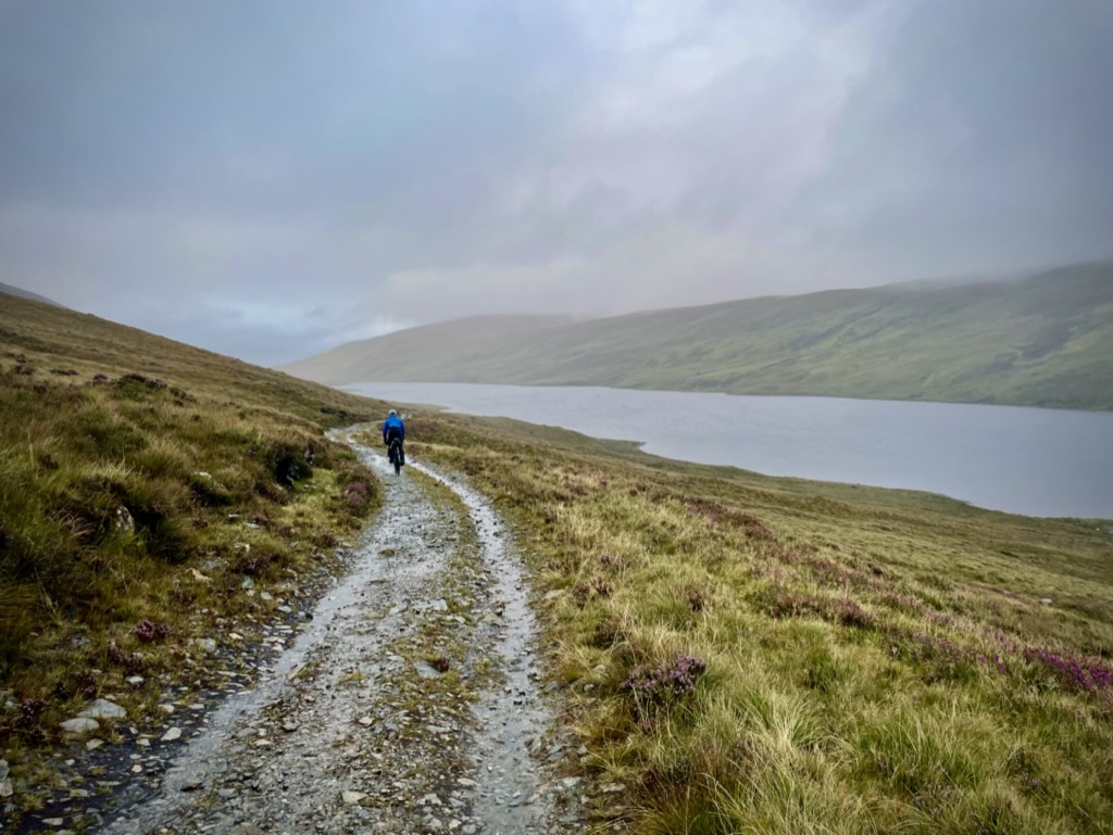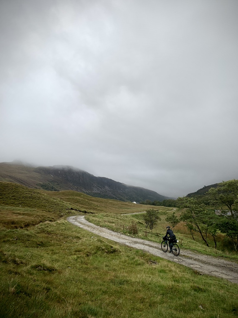 It was not without trepidation, though. I had heard rumour of singletrack, hike-a-bike and rough roads…but it was worth a try. After passing the tarmac-cum-gravel road past a quarry, we joined some excellent gravel tracks to East Rhiddoroch Estate. The landscape around us became increasingly rugged and remote, with high hills disappearing into the thick cloud overhead. Meanwhile, rain chased us up the glen as our thoughts turned towards our bothy bedroom.