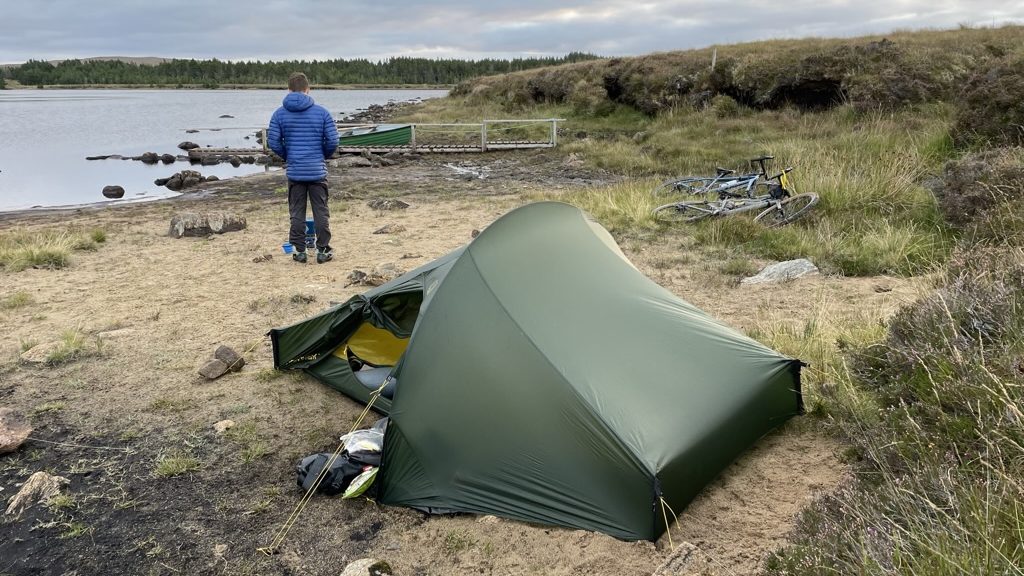 The final leg of the day saw me taking the head of our two-person peloton and sticking my nose into a brutal headwind as we hunted for our camp spot for the night. After 15km, we veered off the road and traipsed over rutted ground towards a loch, passing stands of cut peat to finally pitch our tent on a fairly marginal spot on the lochside.