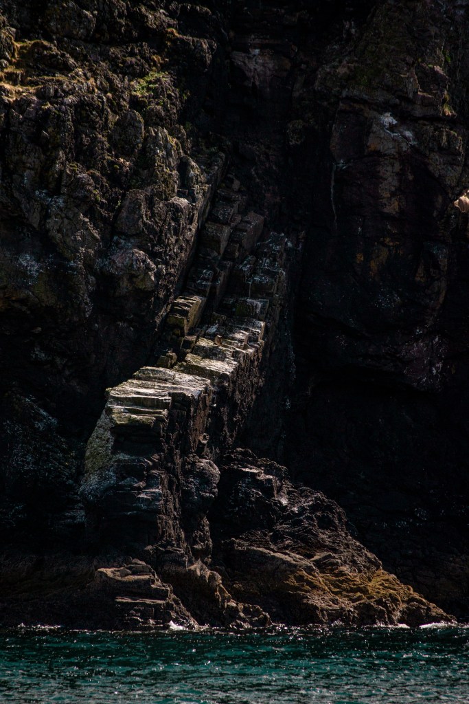 This sea cliff drew my eye. We were on a boat trip from Oban on our ‘mini-moon’ immediately after our wedding. The colours and light immediately caught my attention. It took my a few tries to get the composition right, but I enjoy this meeting of land and sea, and the dark uncertainty within the cracks of the cliff face.