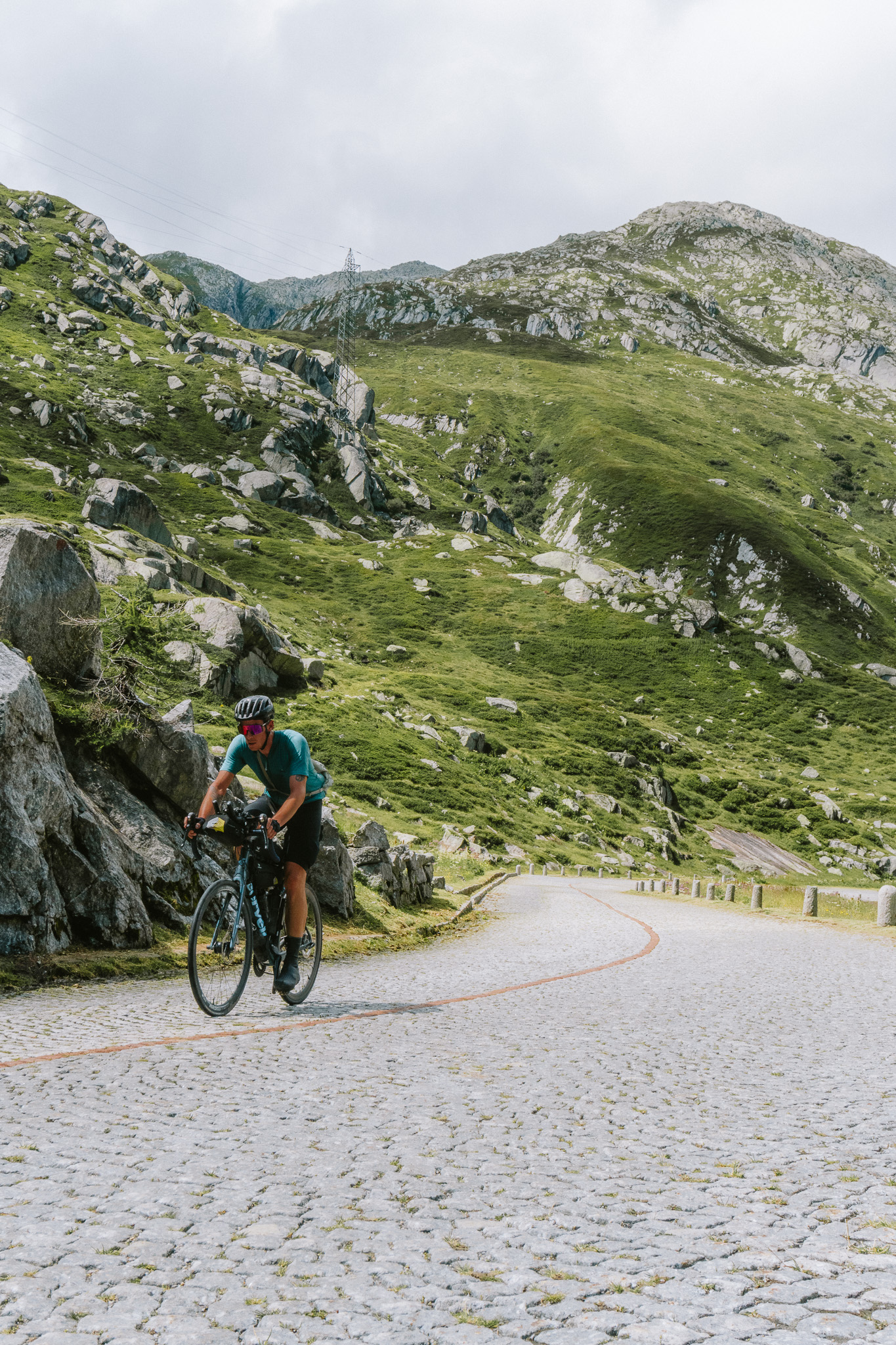 There are a lot of shots I could use (and will show more below) to symbolise the TCR, but this is one of them. Will Voudsen is here riding the final part of the San Bernardino Pass, one of dozens of enormous climbs these riders take on as they traverse Europe.