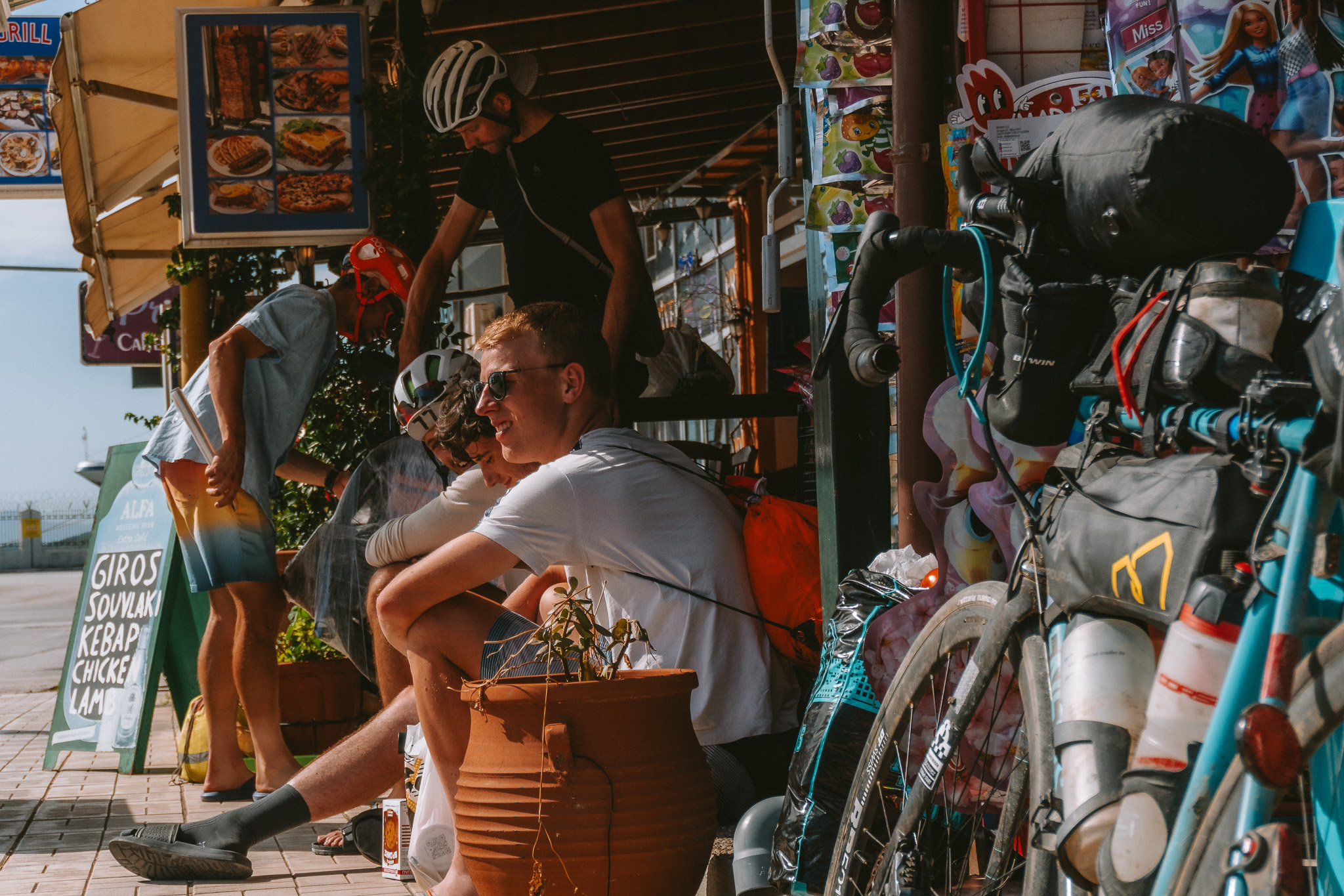 As I sat down to pizza at a restaurant on the square, having struggled to get a good shot, a girl sat down and began to sing and play the piano just opposite me. After watching her for a while, I moved round to take a shot, trying to contextualise the Duomo in its modern setting. I love the outcome, having deepened the blacks and shadows to remove the clutter in the foreground of piano and tourists, making this high-contrast shot of the Duomo at sunset. I have a few more from the trip home below, including some of riders awaiting the ferry from Igoumenitsa to Italy.
